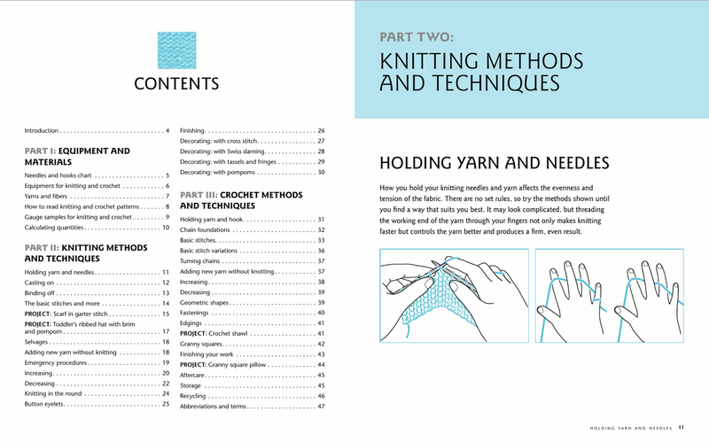 There are easy patterns for knitting a scarf and a toddler's ribbed hat with brim and pom poms. You will be able to crochet a shawl and a granny square pillow with a bit of practice. You will be showing off your first projects in no time.